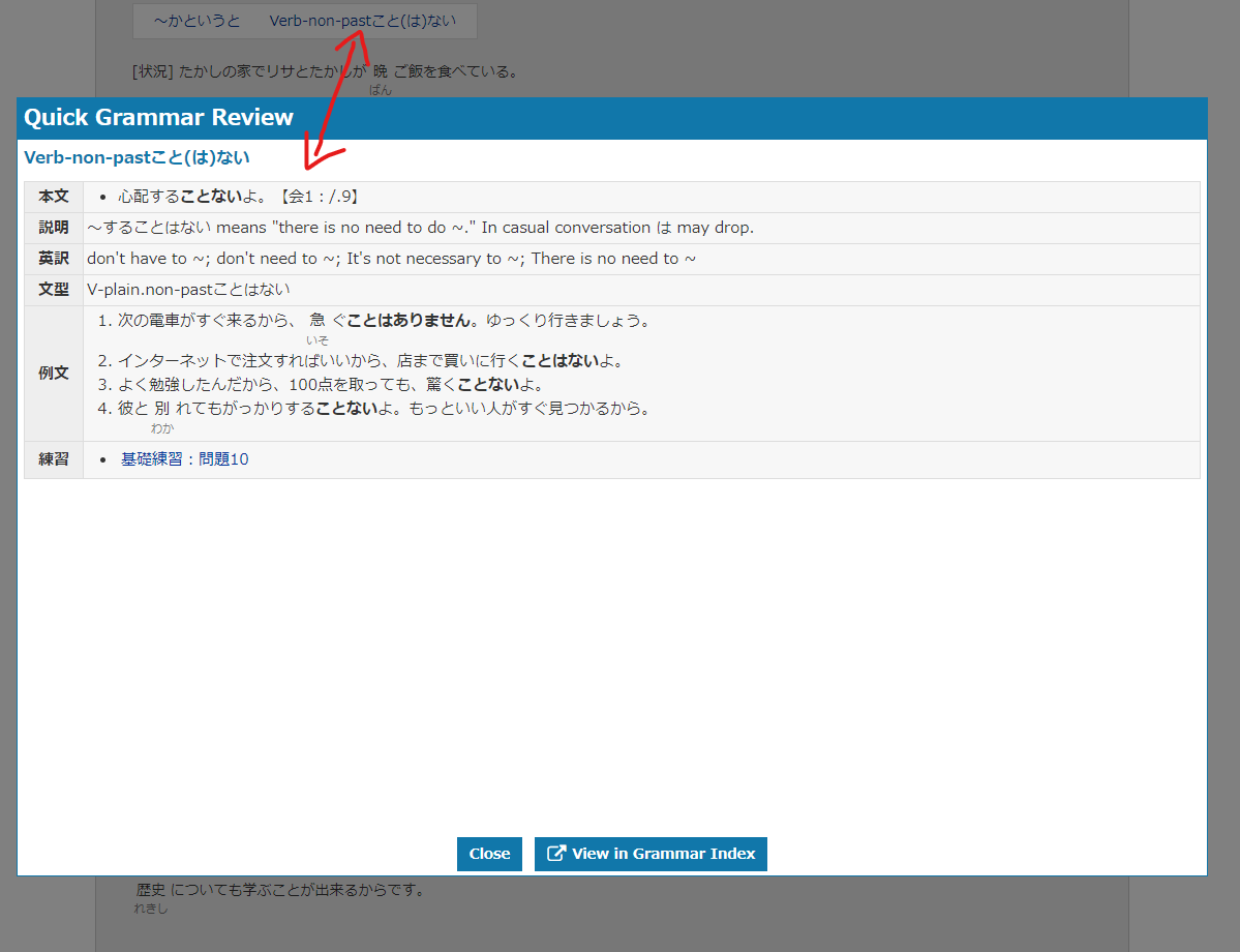 - Do the Grammar Workbook Exercises for the current lesson. If anything is unclear, feel free to click the link to the grammar point in the current exercise to review it (example). You can also review all grammar learned in Tobira in the Grammar Index.